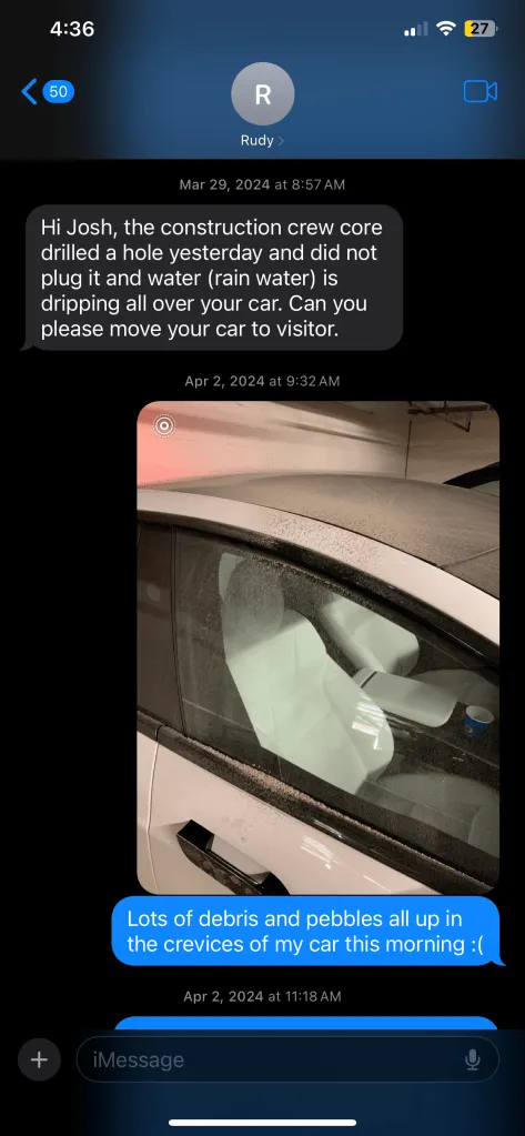 Text message thread alerting the property manager to damage caused to my vehicle