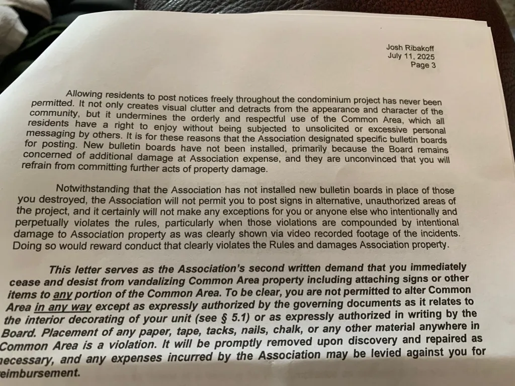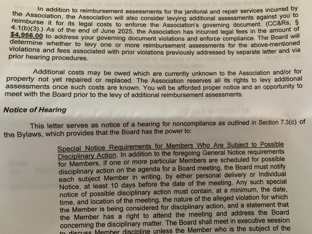 Below are photos of parts of the HOA’s July 11, 2025 letter.