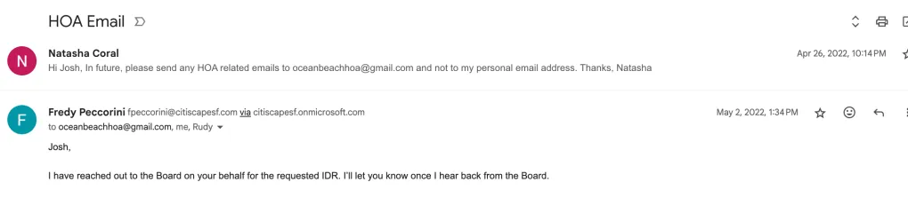 On April 26th, 2022; The board asks me to stop sending the complaints to the personal email. I immediately stopped, and and sent the complaints to the new HOA gmail account they created.