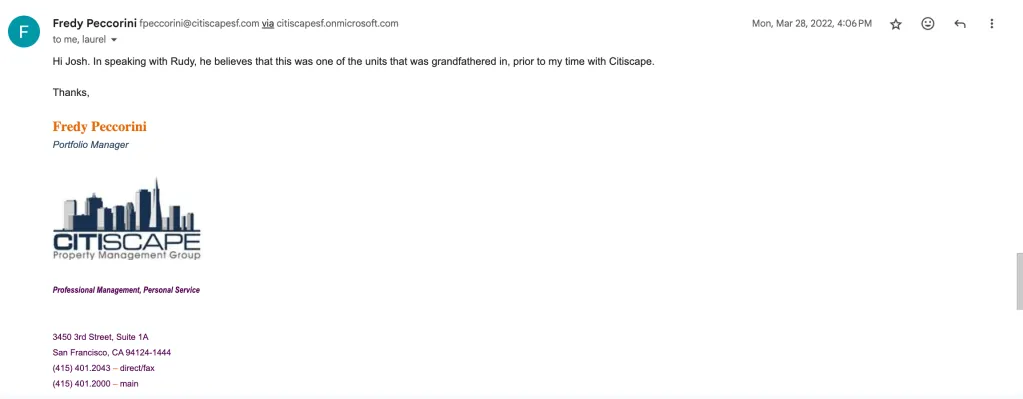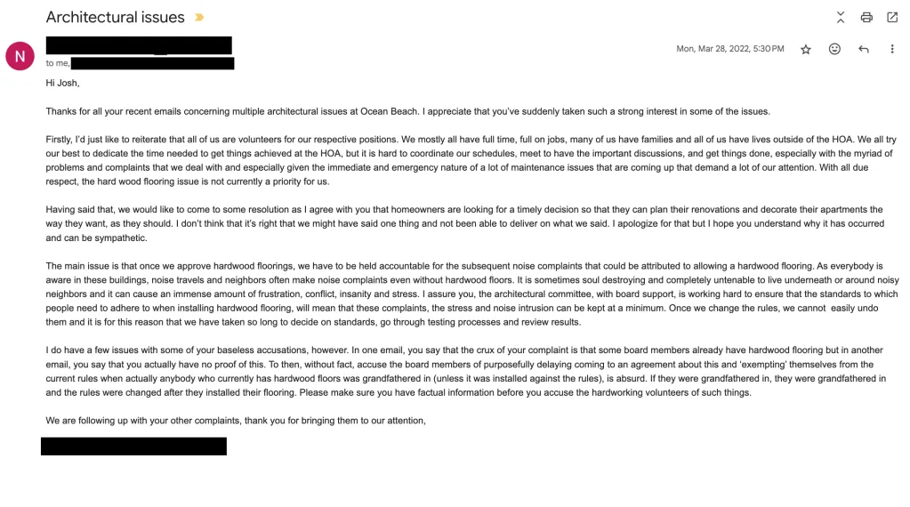 Prior to the board banning my emails, a board member wrote a group email on March 28th, 2022. In it, the board member states that these units were “grandfathered” in. The board member also accuses me and other homeowner(s) of making “baseless allegations” about board members having the flooring themselves, but doesn’t deny it and incorrectly tells a resident who is CCd and lives under this flooring that “there is no proof” (which isn’t the point):