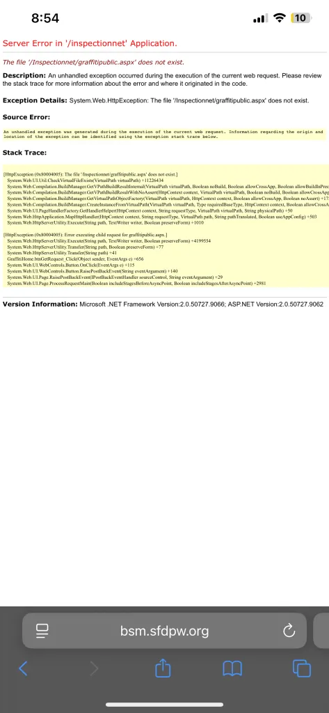 I Tried to look up the graffiti notice on the City’s website… and was greeted by a stack trace instead of details.