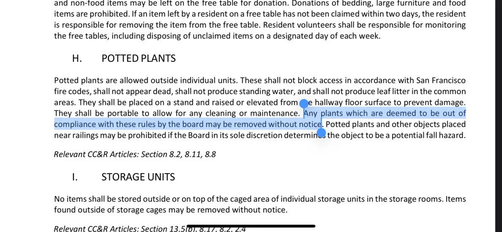 The HOA at 825 / 855 / 875 La Playa St. has proposed new rules. Residents who speak up now face ambiguous email bans under subjective criteria, or even restricted access to common areas, and — most absurdly — the seizure of plants without notice.